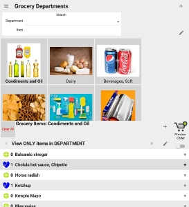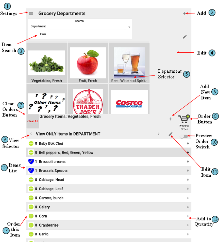 PleasePickUp! installs with grocery items arranged by department/aisle. Each department has a button with picture in the Grocery Departments menu.